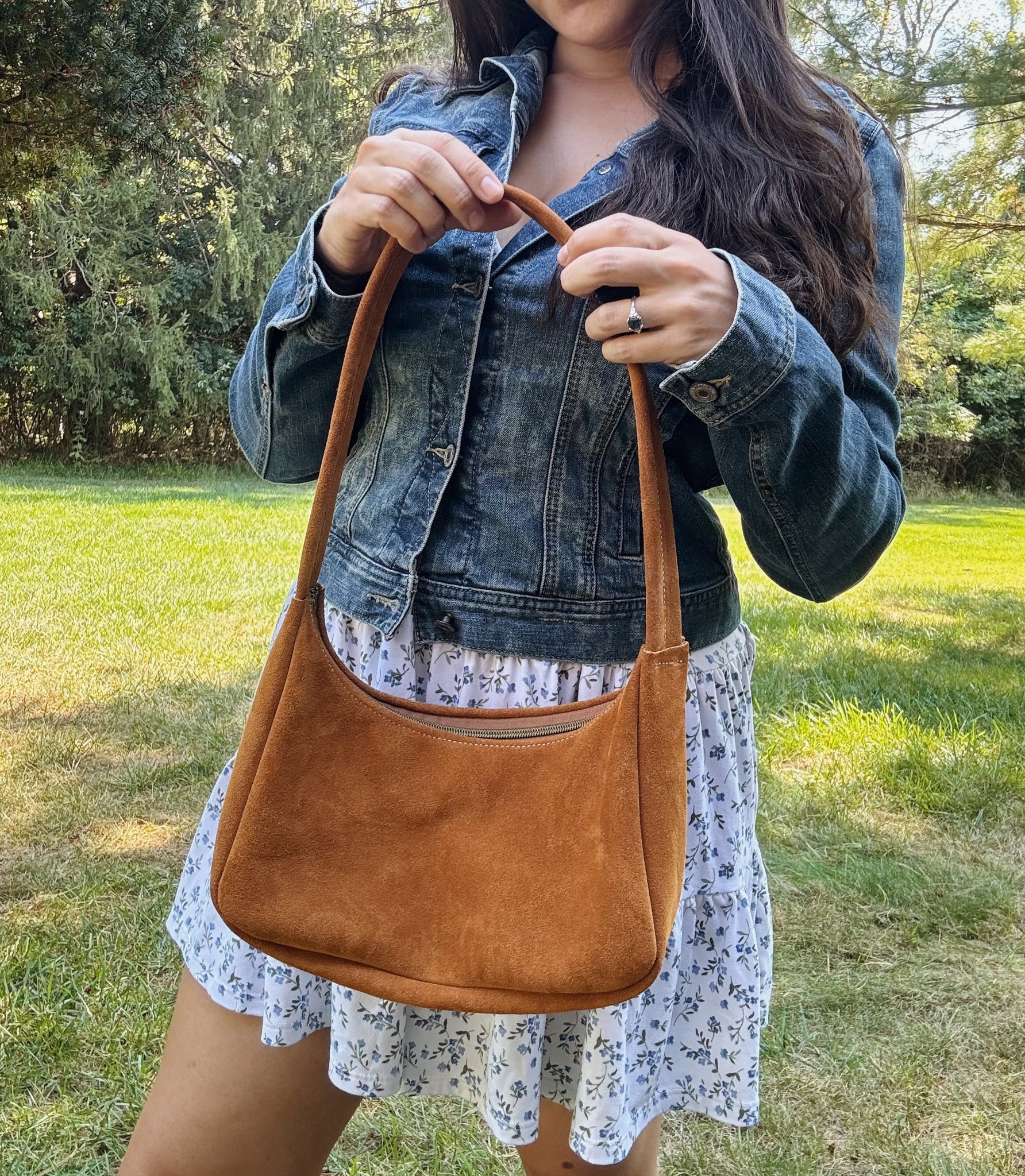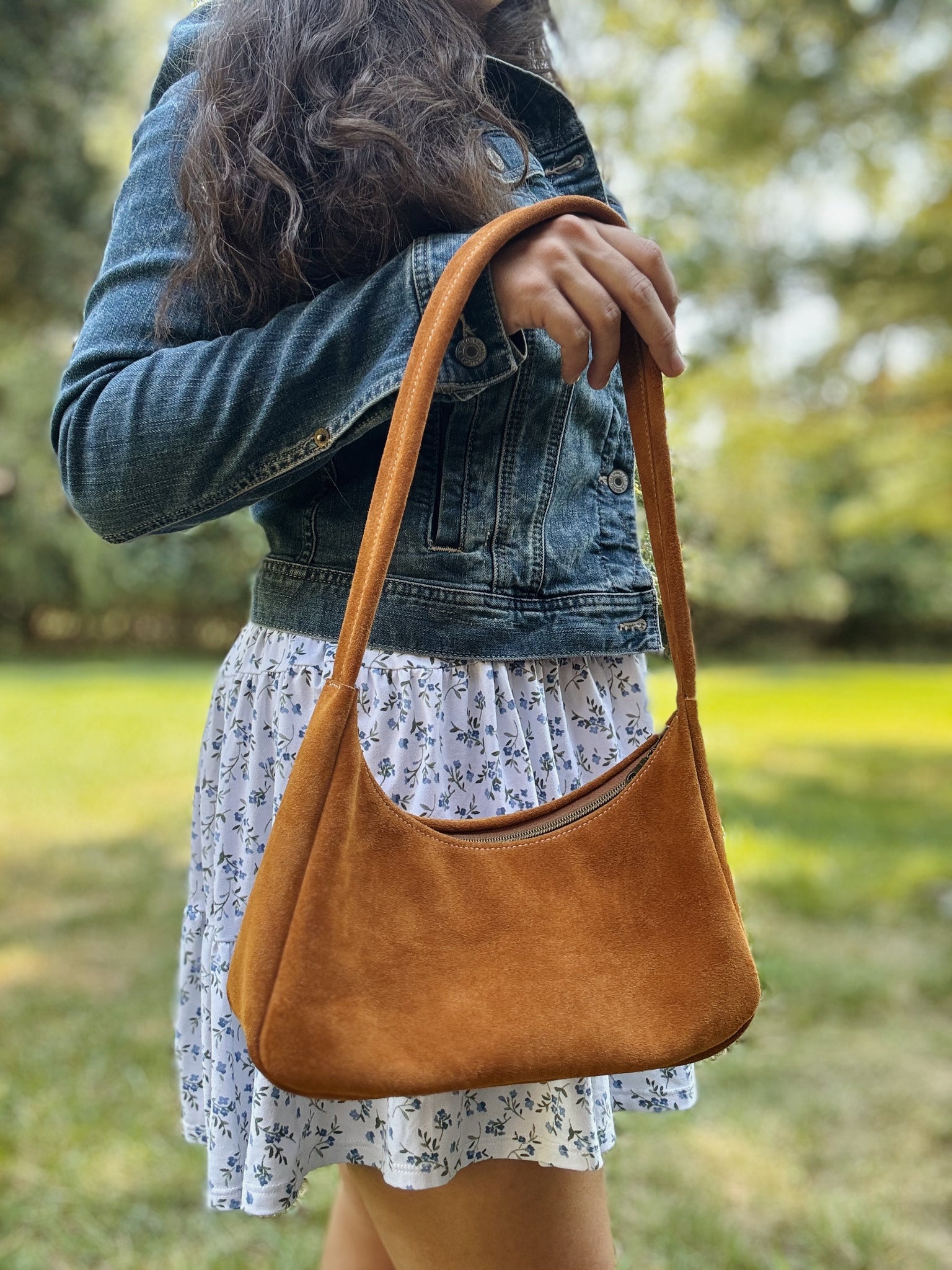 Beautiful western “Y2K” style leather shoulder bag in roughout saddle tan. Zipper closure.